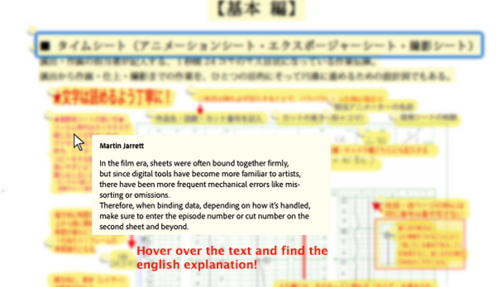 Satsuma covers so many topics and is extremely dense with information from timesheet anatomy, to camera work, effects, and best practices, but the layout and format are quite difficult to follow and read. Since the Japanese text is overlaying images in many cases, it's almost impossible to copy and paste text into machine translation in order to get through the text as someone who can't read Japanese well.